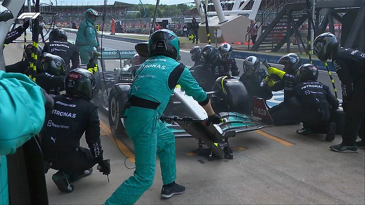 Ах, шансы Льюиса побороться за победу были потеряны механиками, которые задержали Льюиса во время смены шин - обе "Феррари" пролетели мимо, Льюис уступает им 3 секунды.