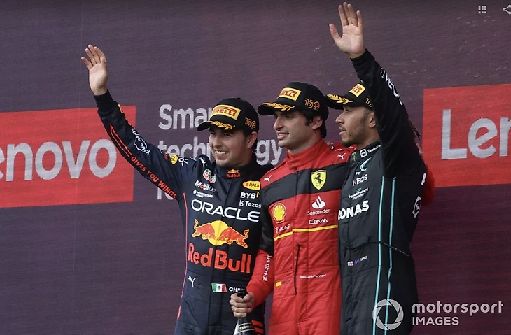 Вслед за Сайнсом на подиуме финишировали Серхио Перес на «Ред Булл» и Льюис Хэмилтон на «Мерседесе». Причем за несколько кругов до конца. На последних метрах разгорелась дикая четырехсторонняя битва между Пересом, Хэмилтоном, Шарлем Леклером и Фернандо Алонсо, которые пересекли финишную черту именно в таком порядке.