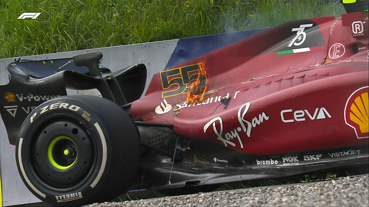 А болид Сайнса натурально горит! Карлос еле-еле успел выбраться из кокпита!