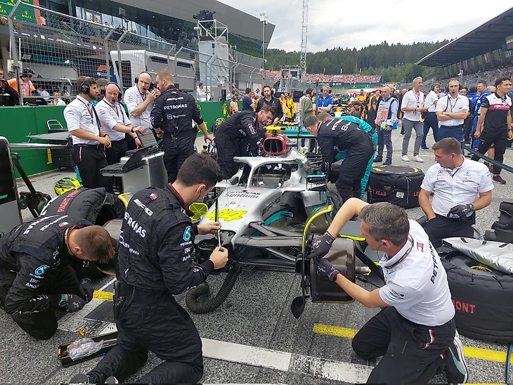Какие-то проблемы на болиде Хэмилтона - механики разобрали нос "Мерседеса" и стараются устранить неполадки. Судя по всему, проблемы связаны с работой тормозов.