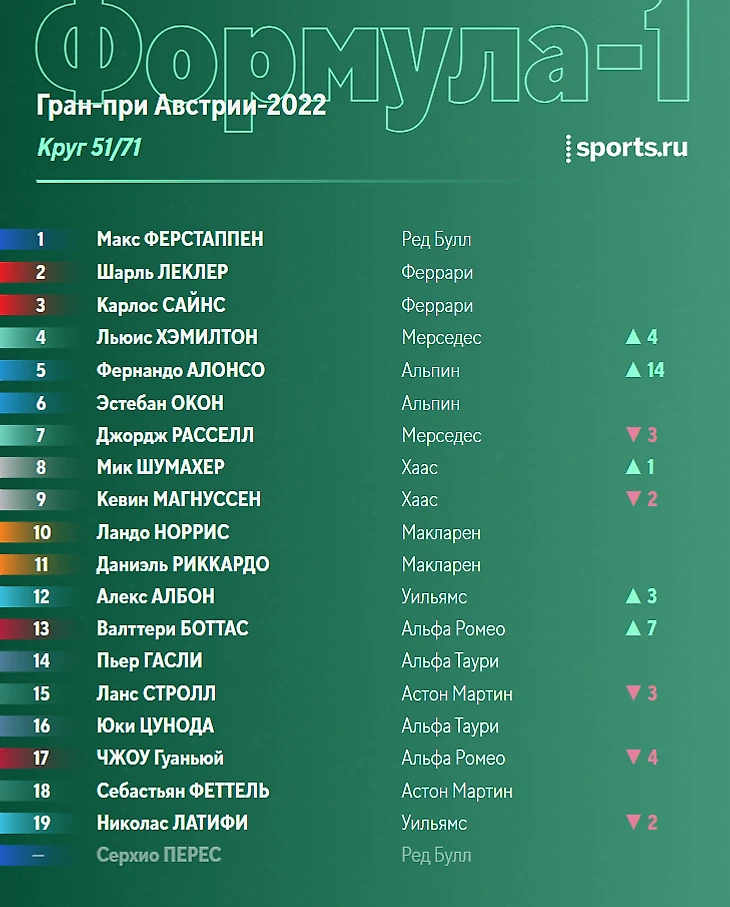 Отыгрывается и "Мерседес" - Расселл воспользовался ситуацией и обогнал Окона. Ферстаппен же продолжает медленно но верно приближаться к Леклеру, штампуя лучшие круги.