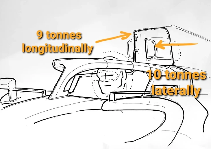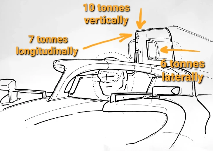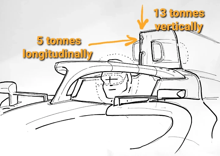 Вертикальная нагрузка – 13 тонн при продольной в 5 тонн, лобовая в 9 тонн при боковой в 10 тонн, и комплексная: вертикальная в 10 тонн при боковой в 6 тонн и продольной в 7 тонн. Для сравнения: гало обязано выдержать минимум 5 секунд воздействия эквивалента в 12 тонн с любой стороны и по любому вектору – и, к счастью, правила предписывают позиционировать шлем пилота на 75 мм ниже по отношению к нему.