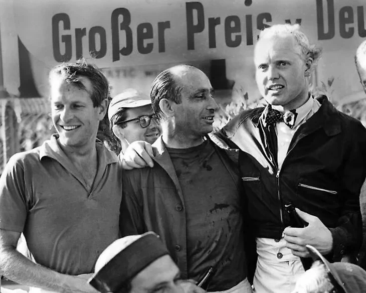 Питер Коллинз, Хуан Мануэль Фанхио и Майк Хоторн после гонки на Нюрбургринге в 1957