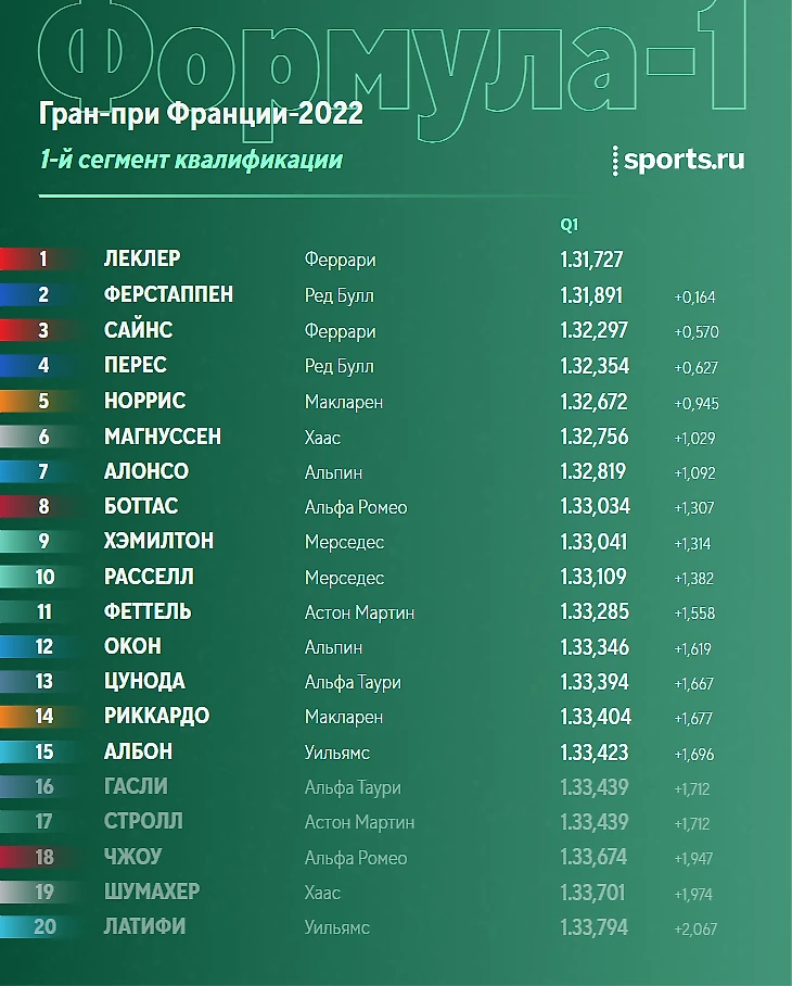 Все, первый сегмент закончился. В последней попытке многие сумели улучшить свое время, а Албона развернуло. Из борьбы выбыли Гасли, Стролл, Чжоу, Шумахер и Латифи. Мик вроде бы показал 6-е время, но его круг аннулировали из-за несоблюдения границ трека.