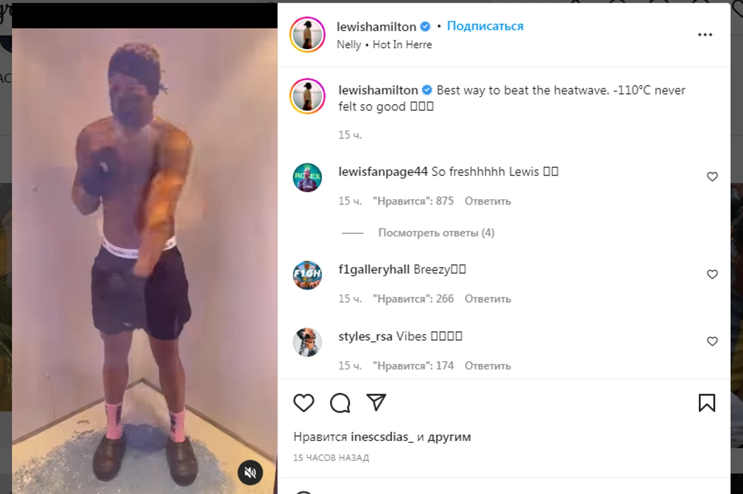 Перед Гран-при Франции Льюис Хэмлтон запостил в сториз секрет спасения от аномальной европейской жары – «никогда еще – 110 градусов не ощущались так хорошо».