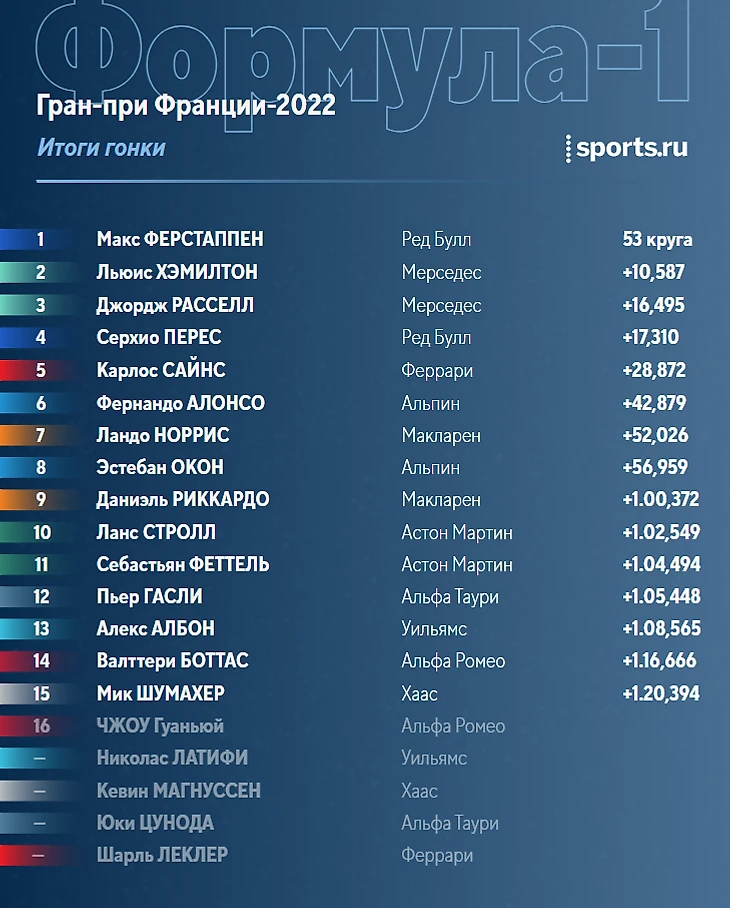 А ведь если бы «Феррари» не тянула с решением провести пит-стоп так долго, Карлос мог бы запросто претендовать на подиум даже со штрафом – ведь на финише с лишней остановкой он отстал от Переса всего на 11 секунд, а от Расселла – на 12 (то есть за 6 гоночных кругов он сократил 18-19 секунд).