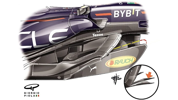 Во Франции эти лопасти были разнесены гораздо дальше друг от друга. Это означает, что «Ред Булл» стремится сместить аэробаланс назад, увеличивая долю потока, поступающего в туннель, и уменьшая нагрузку на переднюю часть днища. Это соответствует тому, что они компенсировали использование заднего антикрыла меньшего размера, которое они считали необходимым для хорошей скорости на прямой.