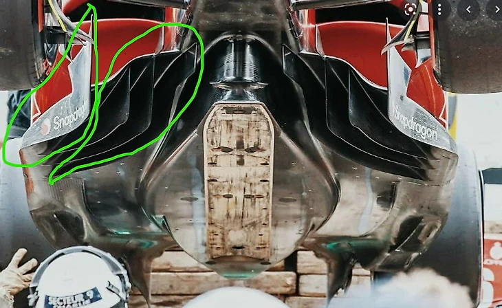 Перед Францией команда установила две внешних лопасти очень близко друг к другу, так что они сходились к задней части, и взаимодействие между ними, вероятно, способствовало ускорению воздуха, выходящего в сторону от туннелей. При этом создается разность давлений между верхней и нижней поверхностями днища в этой точке. Это происходит в передней части автомобиля, и, следовательно, аэродинамический баланс будет направлен вперед. Любой поток воздуха, используемый для достижения этой цели, — это поток воздуха, не подаваемый в туннель, что еще больше усиливает этот баланс.