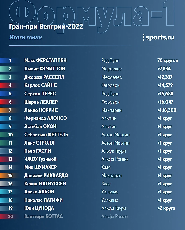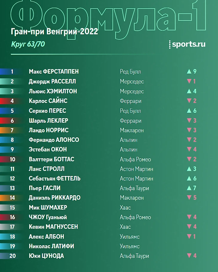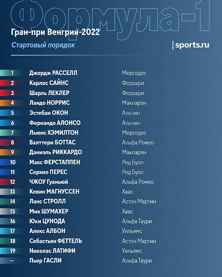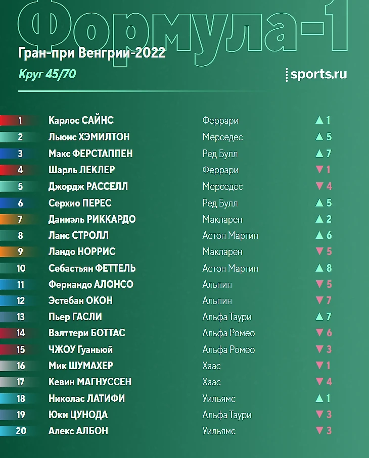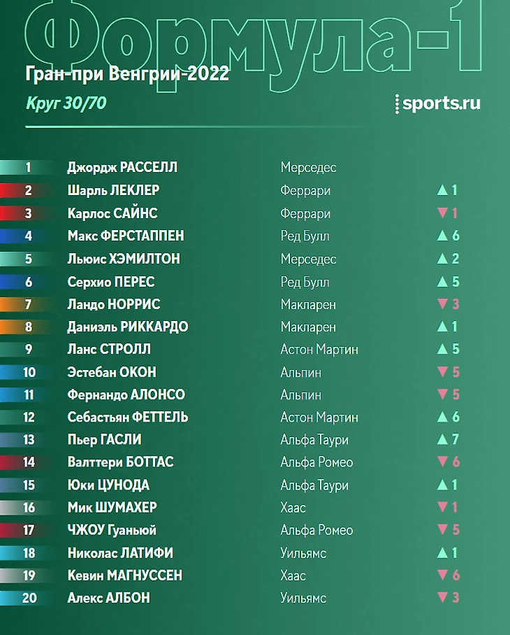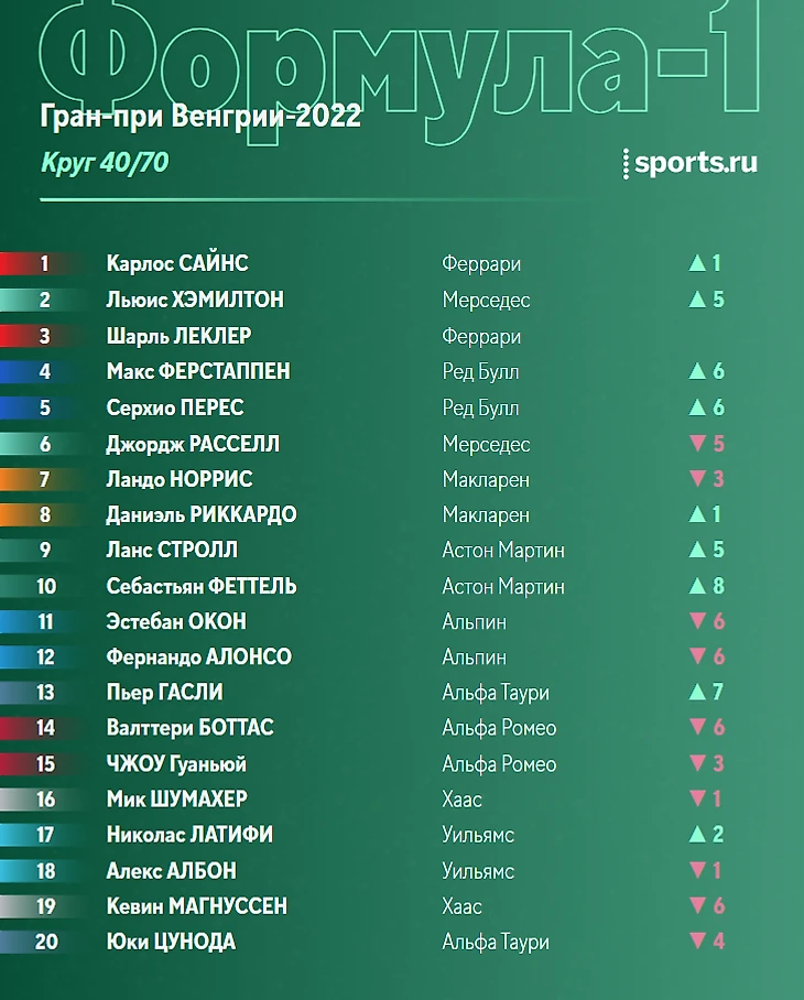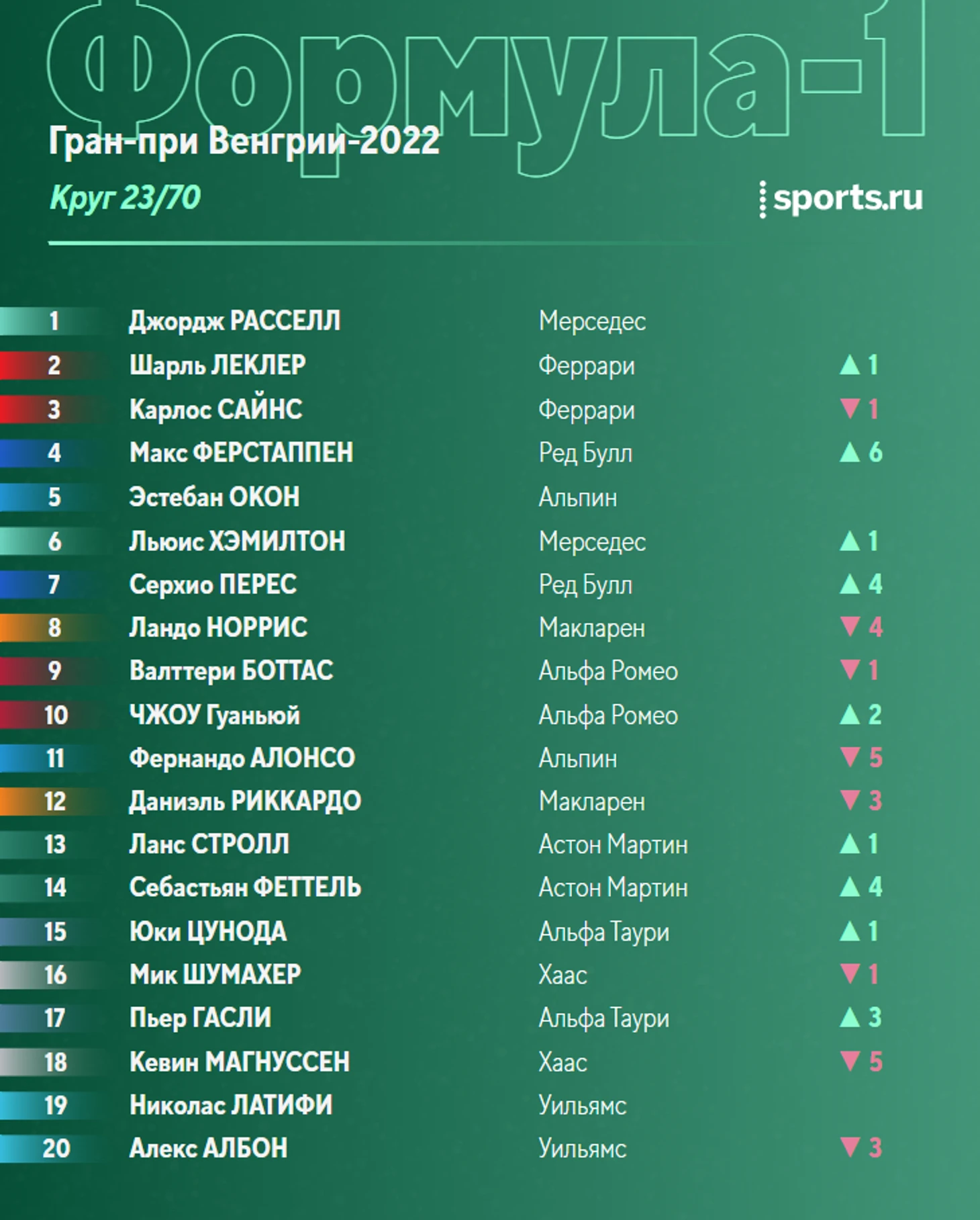 Далее расположились Сайнс, Перес, Леклер, Норрис, Алонсо, Окон и Феттель.