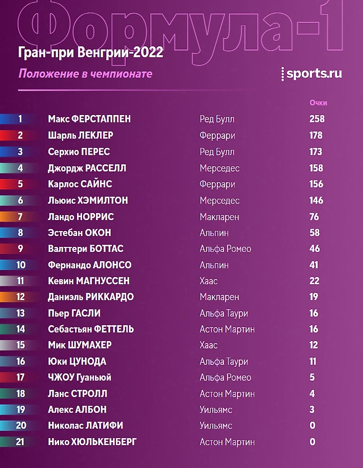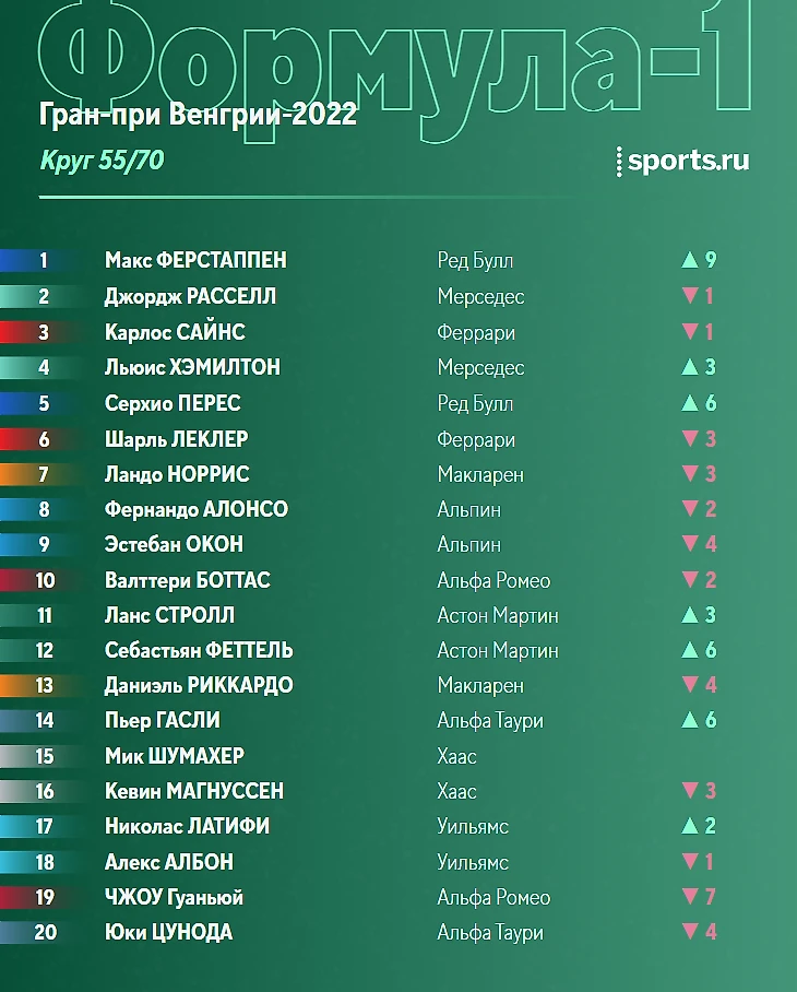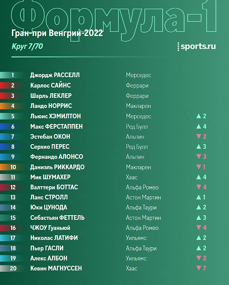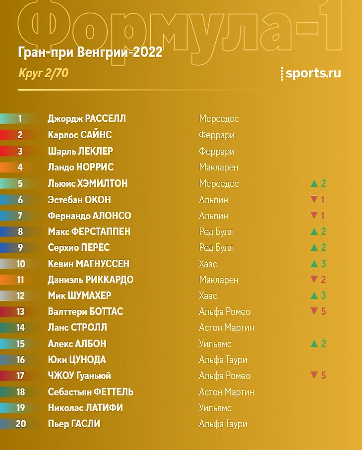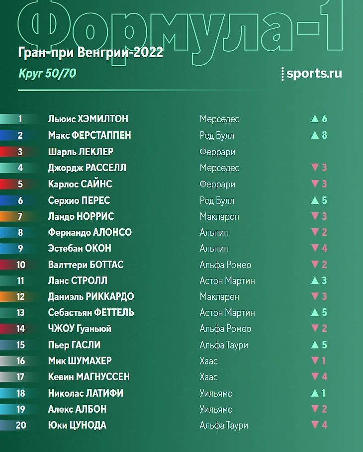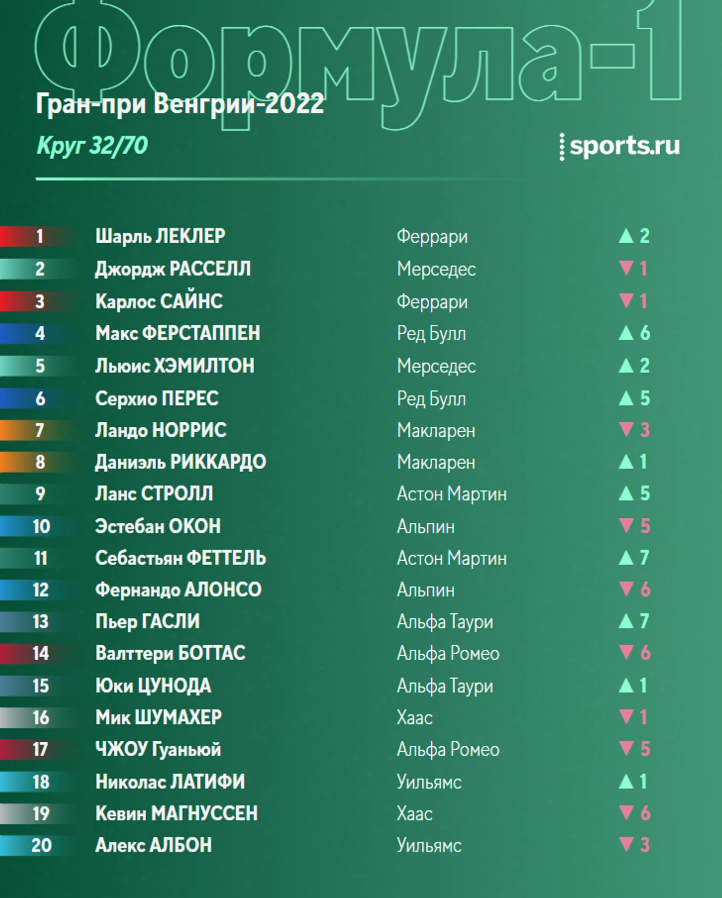 Далее расположились Сайнс, Перес, Леклер, Норрис, Алонсо, Окон и Феттель.
