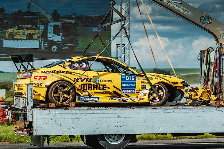 По неведомым причинам «Ниссан» Антона в момент постановки решил расстаться с передним бампером, который полетел прямо под машину Шнайдера. И все бы ничего, если бы он не попал под передние колеса автомобиля — руль из рук Леонида выбило, колеса заблокировались, и вместо постановки в занос он оказался на обочине.