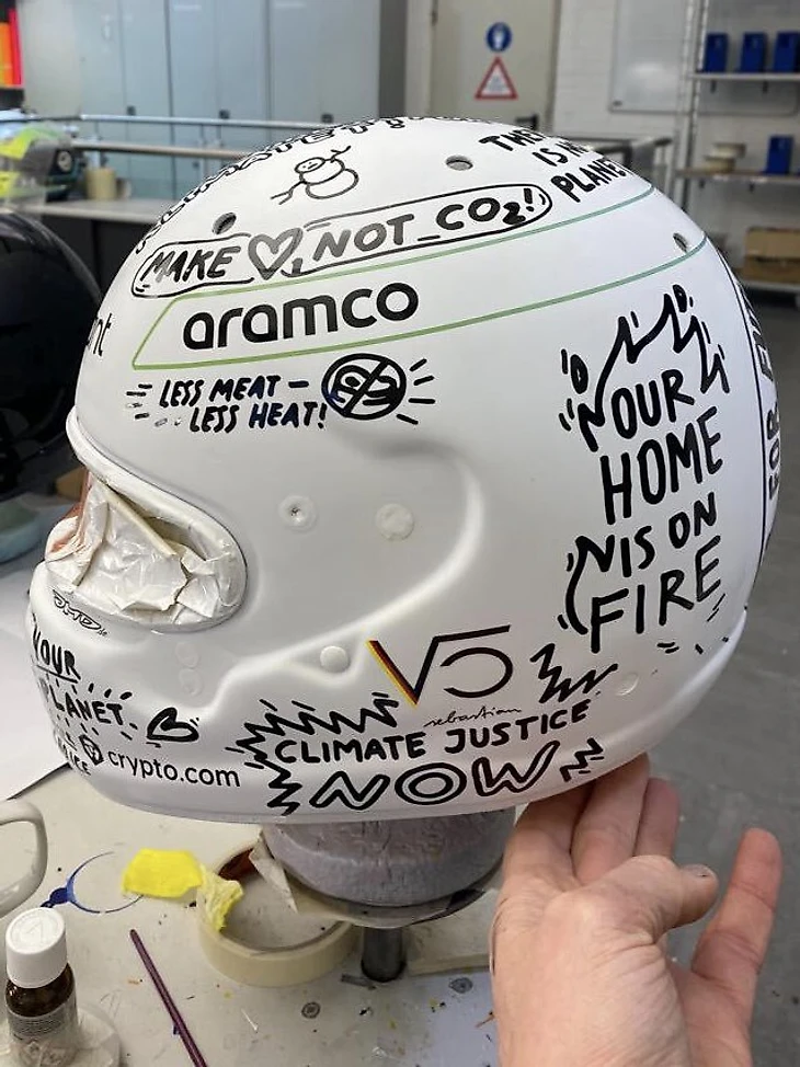 Но больше всего внимания привлек шлем для Гран-при Канады с призывом остановить добычу нефти из нефтеносных песков.