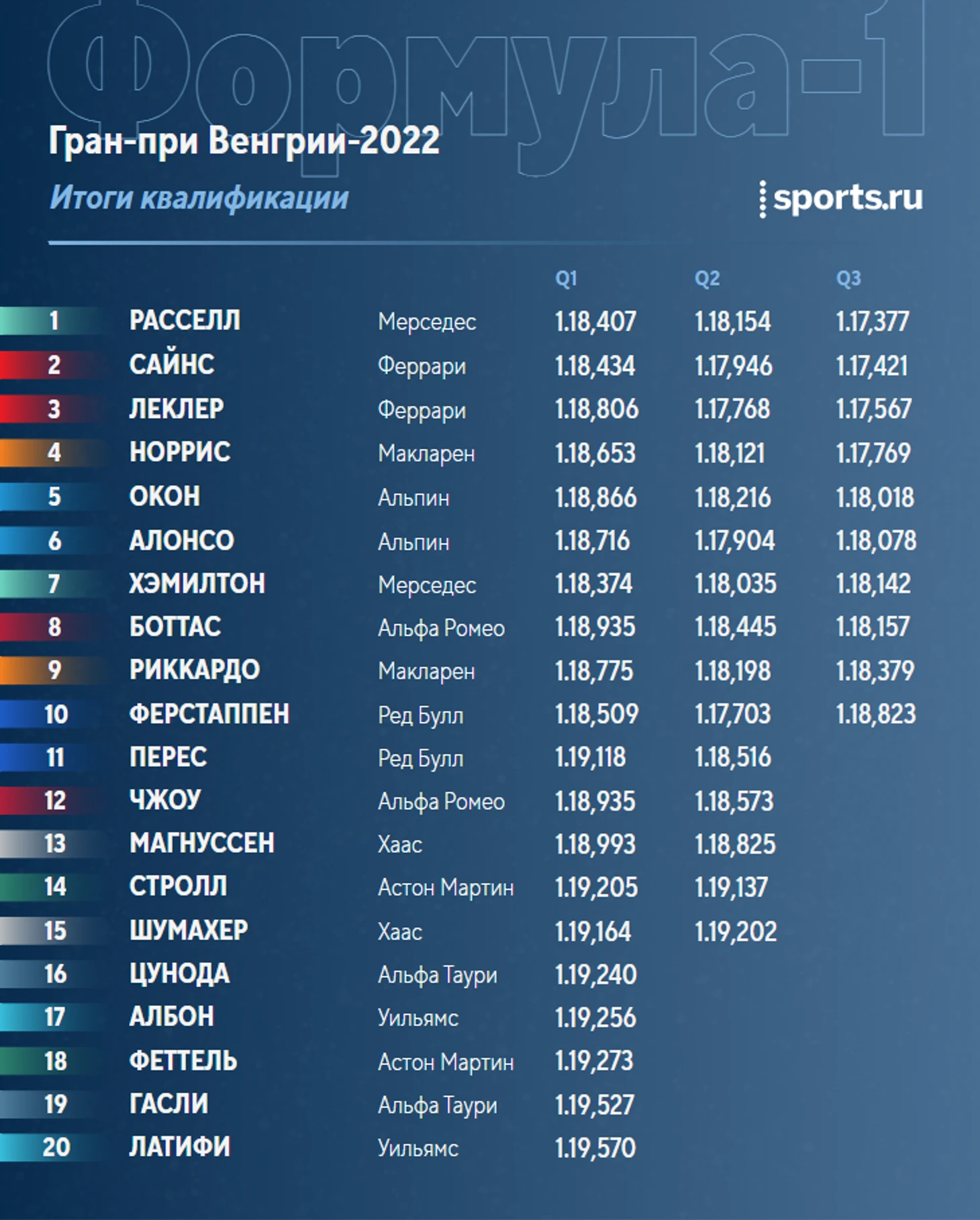Финал квалификацикации Гран-при Венгрии – что-то из разряда «ВНЕЗАПНО»: «Феррари» дежурно бьются за поул, Сайнс слегка побеждает Леклера, и вдруг баааааам – первое место уплывает в «Мерседес». Да еще и не Хэмилтону, а его юному напарнику Джорджу Расселлу.