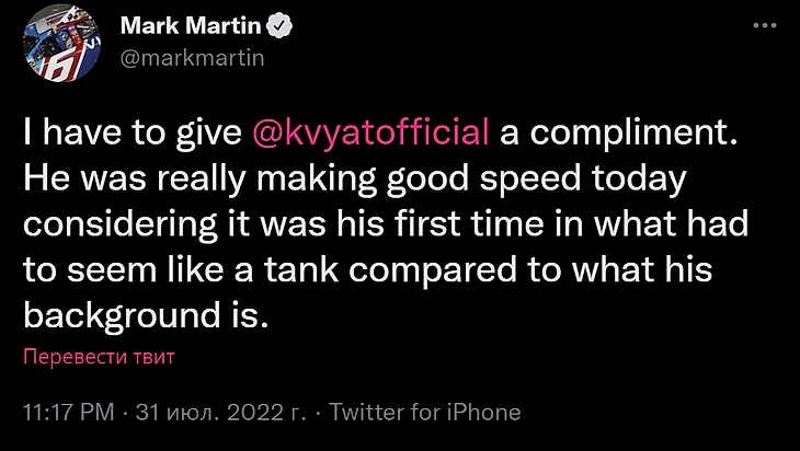 «Какая гонка! Очень доволен своим первым опытом в NASCAR. Фактически впервые я оказался за рулем своей машины в самой гонке! Несколько отличных сражений, большое количество пройденных кругов, прогресс с каждым из этих кругов. Мне понравилось», – написал Даниил после заезда.
