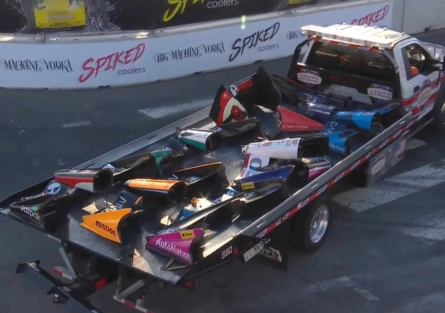 Грузовик, полный разбитых кусков болидов – красочные последствия двух завалов на узкой трассе американского Гран-при