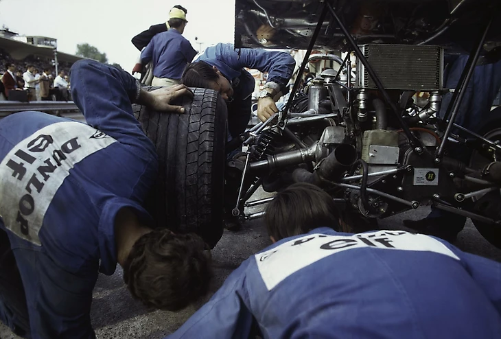 Йохен Риндт на пит-лейн со своей женой Ниной во время последней тренировки. Несколько часов спустя он на «Лотусе» разобьется в «Параболике». Риндт умрет по дороге в больницу в Милане. Йохен станет единственным посмертным чемпионом мира после пяти побед в начале года.
