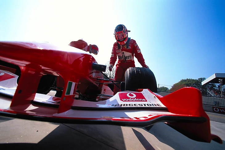 Михаэль Шумахер на своей «Феррари» F2003-GA. Он не только выиграл гонку, но и установил рекорд самой высокой средней скорости в Гран-при – это 247,586 км/ч.