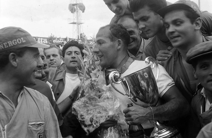 Стирлинг Мосс празднует первую из трех подряд побед в Монце в 1956 году.