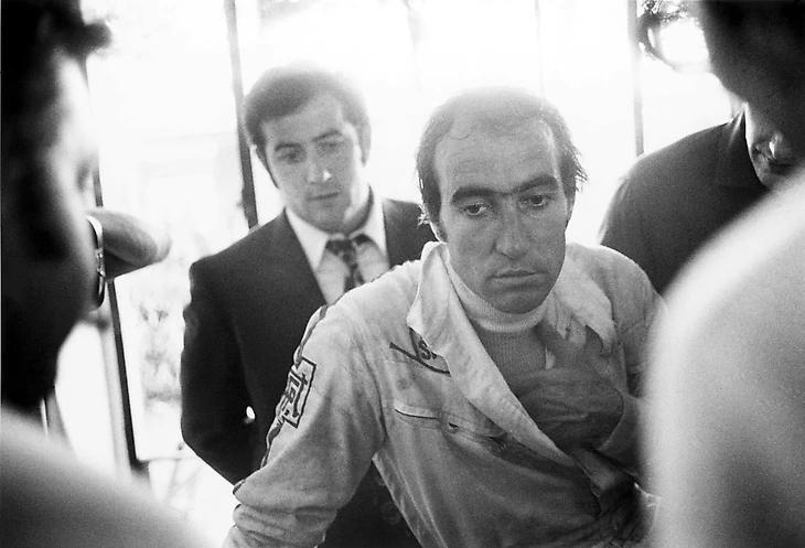 Победитель Гран-при Клей Регаццони подавлен после смертельной аварии Йохена Риндта.