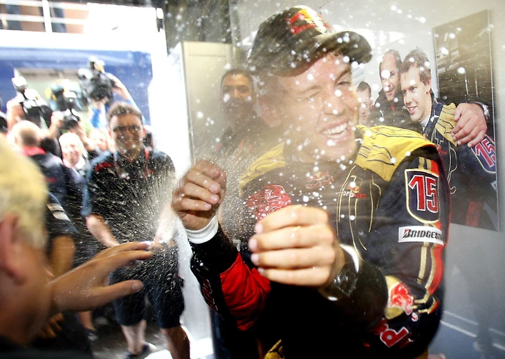 Себастьяна Феттеля обливают шампанским после его поул-позиции. Феттель стал самым молодым обладателем поула (этот рекорд принадлежит ему до сих пор) и самым молодым победителем гонки (этот рекорд с 2016 года принадлежит Максу Ферстаппену).