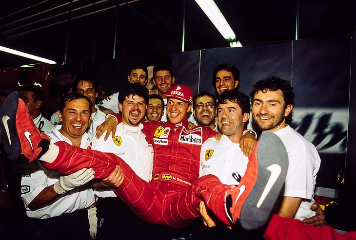 Михаэль Шумахер празднует с членами команды «Феррари» первую из своих пяти побед в Монце.