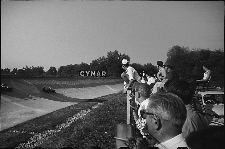 Зрители наблюдают за Филом Хиллом и его «Феррари» Dino 156, лидирующим на скоростном участке овальной трассы с бэнкингом.