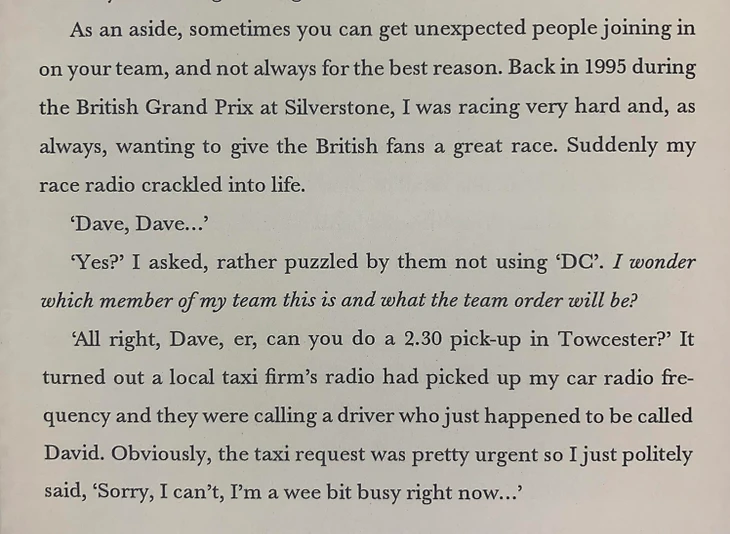 Последнее, кстати, временами выстреливало вплоть до середины 90-х: без быстрого двустороннего шифрования команды просто старались использовать редкие и необычные волны, но все равно иногда случались непредвиденные ситуации. Одну из самых нелепых подобных описал бывший гонщик «Уильямса», «Макларена» и «Ред Булл» Дэвид Култхард в автобиографии «Думай как чемпион: как «Формула-1» может прокачать самоорганизацию, эффективность и мотивацию»: