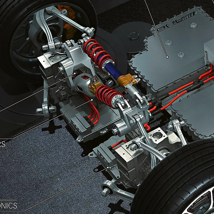 В итоге мощность ДВС срезали на 200 л.с., перенесли прогрев топливной смеси в конвертеры прямо перед впрыском для реализации возможности моментального холодного старта и контроля за температурами установки, и покрыли всю установку особым NVH-корпусом против вибраций и слишком сильного шума (без нее допуск на улицы не давали). Также в машину внедрили 4 электромотора – чтобы она работала и в режиме электрокара. Правда, два из них – на 200 л.с. – заточили полностью под активацию турбо. Еще один – MGU-K на задней оси, и еще два мощностью по 163 л.с. – на передней оси.