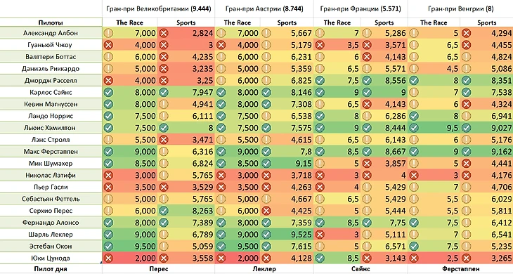 Рейтинг пилотов на Гран-при Венгрии (8):