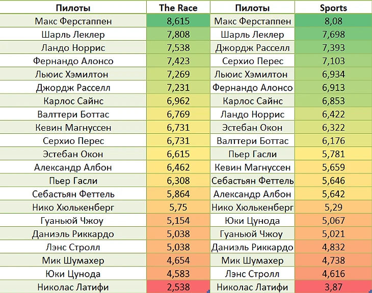Средние оценки за сезон в сравнении с ориентиром в лице издания The Race: