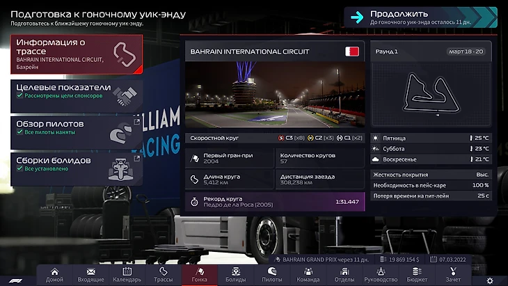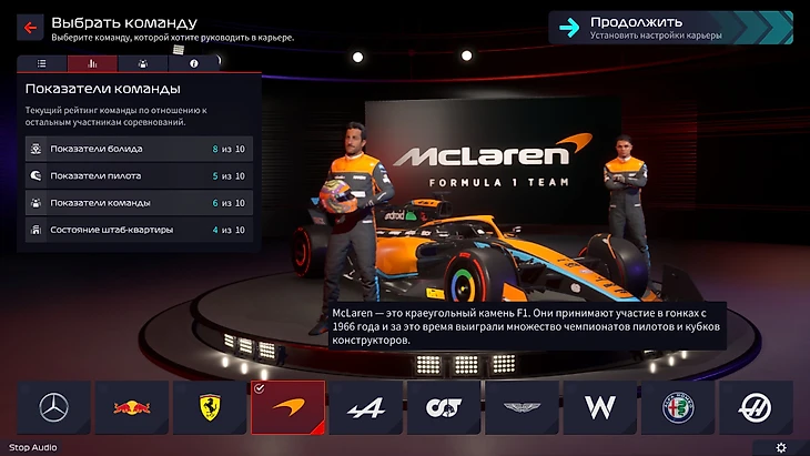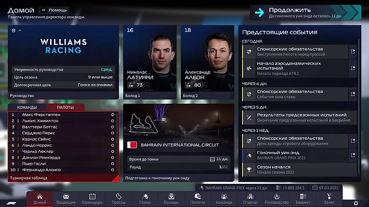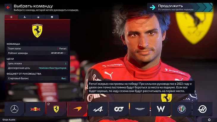 Начинаем новую карьеру и у нас ещё одно видео: Дэвид Крофт рассказывает почему Формулу-1 любят миллионы человек по всему миру, а затем вы попадаете к выбору команды. Здесь отдельный плюс разработчикам — графика у игры выглядит очень неплохо, как для спортивного менеджера (взгляните, например, на Football Manager, вот там хочется плакать), а при выборе каждой команды, игроку кратко рассказывают об истории команды, её выступлении в прошлом сезоне и целях на сезон-2022.