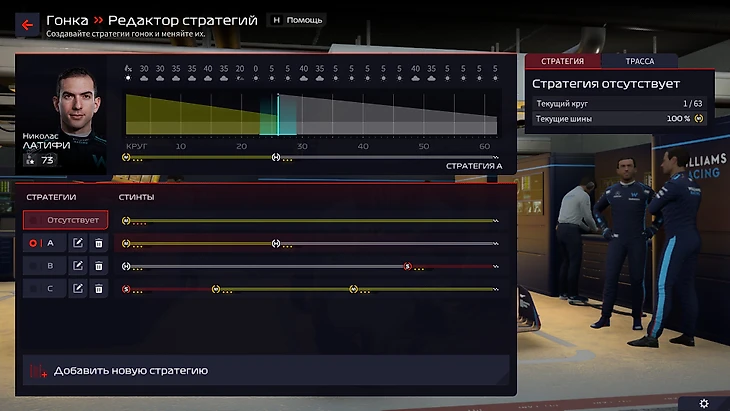 Перед стартом гонки можно выбрать ту стратегию, которой вы хотите придерживаться (никто не мешает вам косплеить синьора Бинотто и придумывать планы со всеми буквами алфавита).