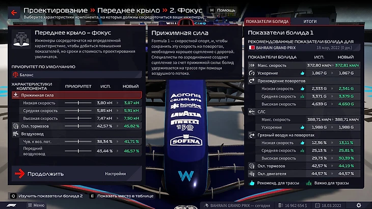 В меню проектирования деталей вы можете выбрать количество часов обдува детали в аэротрубе и время гидродинамических расчетов. Количество этих самых часов зависит от места команды в прошедшем сезоне Кубка Конструкторов, как и в реальной F1.