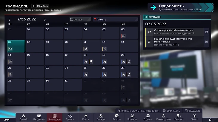 После выбора команды вам предлагают включить обучение, но я не рекомендую вам его включать, если вы хоть раз играли в менеджеры или знаете о Формуле-1 чуть больше, чем человек, непосвященный в королеву автоспорта. Чёрная женщина разжевывает всё так надоедливо, что ищешь кнопку выключения обучения уже через 2 минуты игры. Стартовый экран по своей структуре похож на Motorsport Manager, но такой же ли он внутри? Давайте взглянем.