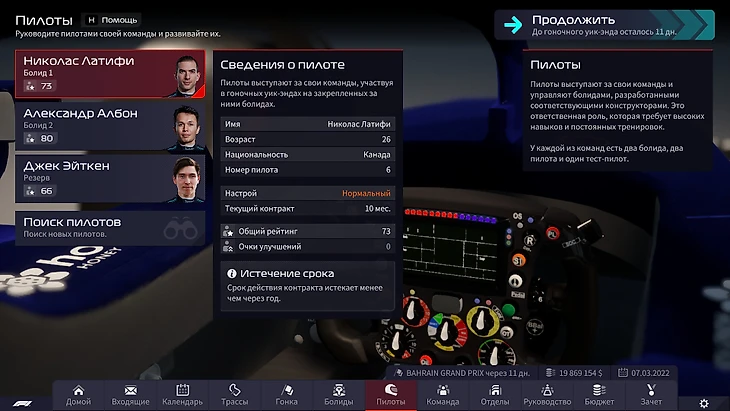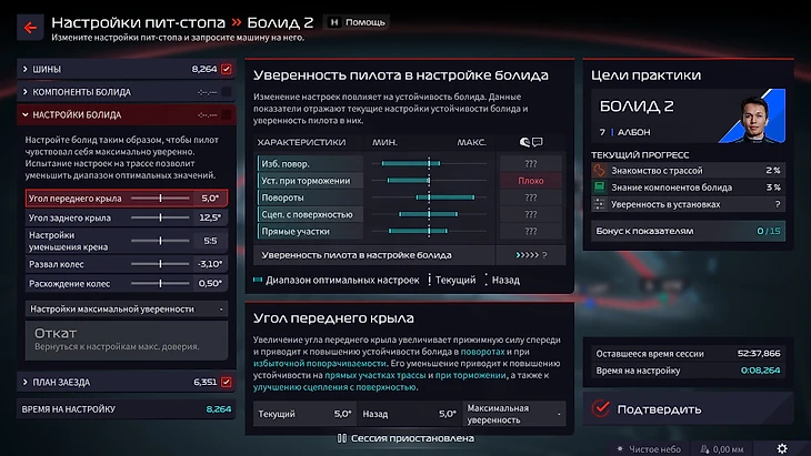 В практиках необходимо попасть в настройки пилотам, что может дать 15 бонусных очков к характеристикам пилота. Можно не сидеть час, а просто симулировать практику и корректировать ползунки между сессиями. Здесь настройка очень похожа на Motorsport Manager.