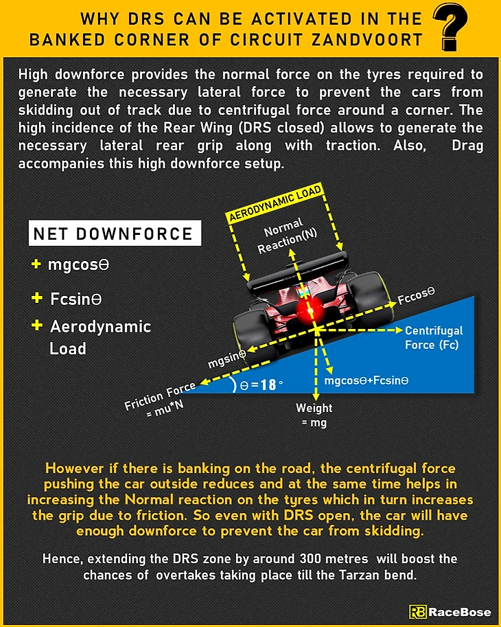Как видим из векторов, чистая прижимная сила в таком повороте складывается из силы тяжести под углом, центробежной силы, направленной вовне поворота, и аэродинамической загрузки. В обычных условиях с закрытым крылом и на ровном треке больше аэродинамическая загрузка, но нет центробежной силы – значит, нужно просто подобрать угол, при котором снижение прижимной силы компенсируется за счет центробежной. По расчетам и бесчисленным симуляциям «Формулы-1» технических штаб выдал конструкторам трека нужный уклон – 18 градусов.