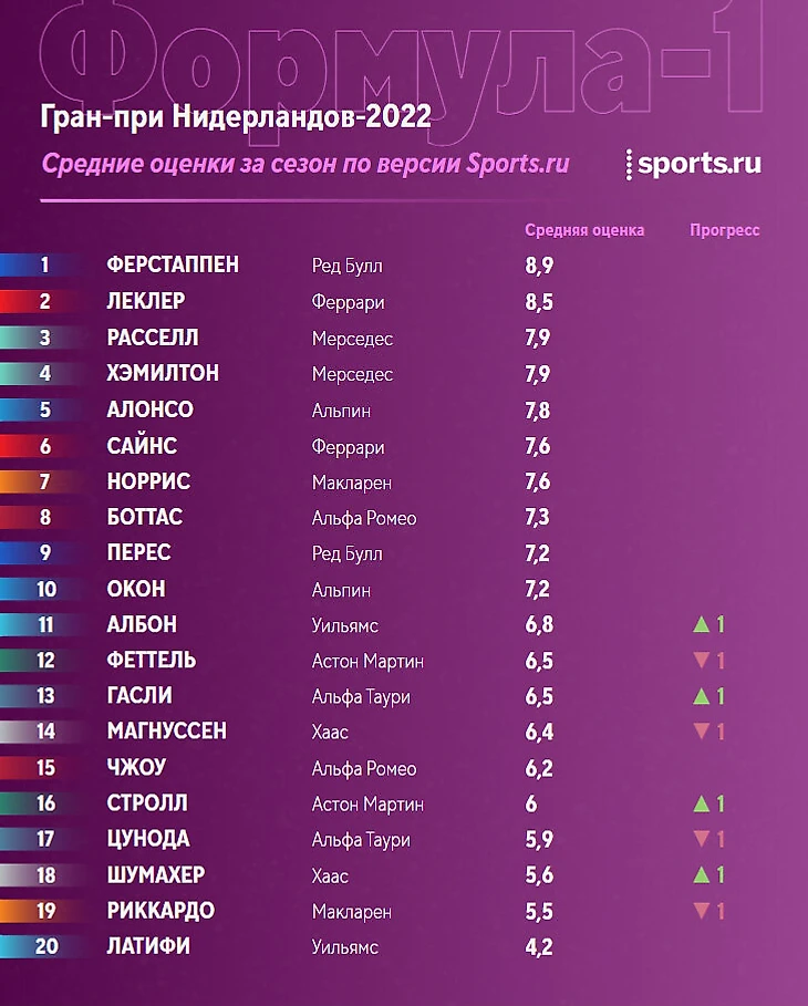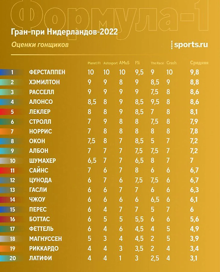 В сводном рейтинге от зарубежных изданий доминирует Ферстаппен с четырьмя «десятками», в то время как Хэмилтон, Расселл и Алонсо отстают от Макса на целый балл. Стролл в жесткой борьбе обогнал Норриса, Латифи умудрился заработать одну «единичку».