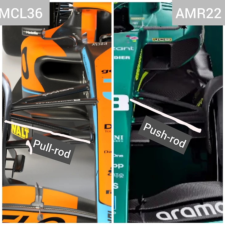 Верхняя передняя тяга установлена очень высоко, а верхняя задняя - значительно ниже. Это обычная особенность автомобилей 2022 года, так как она противостоит погружению автомобиля при торможении, что особенно важно для концепции с граунд эффектом, так как это ограничивает увеличение высоты задней части автомобиля при торможении. Для предыдущего поколения автомобилей с большим креном это было менее важно. Недостатком геометрии против погружения является то, что она облегчает блокировку передних колес, но аэродинамические преимущества автомобилей поколения 2022 года более чем компенсируют это.