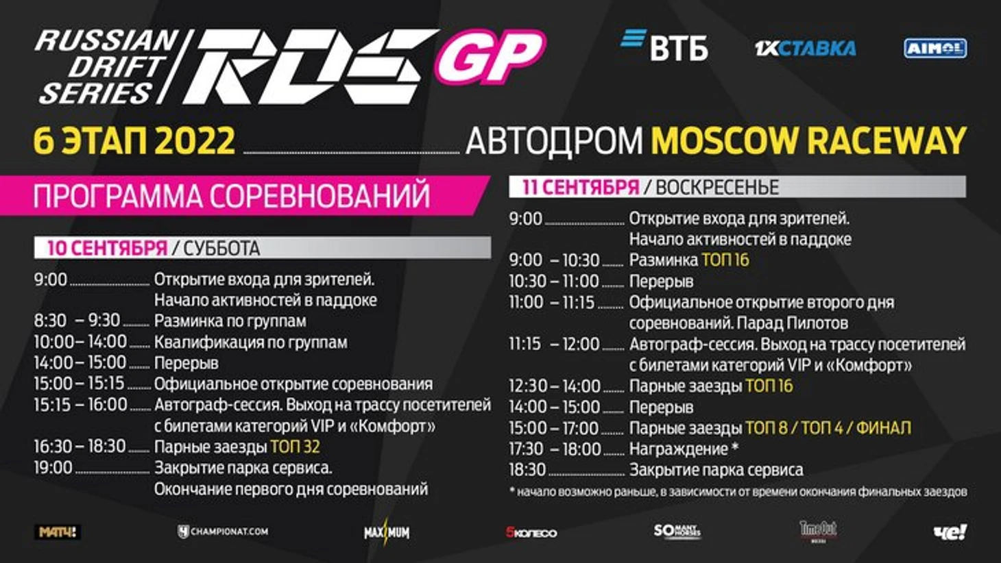 Шестой этап на «Москоу Рейсвей» может вписать в историю RDS GP новое имя победителя и встряхнуть всю турнирную таблицу перед финалом в Сочи. А может быть, поможет закрепиться нынешним лидерам? Уикенд 10-11 сентября обещает стать максимально интригующим. Кто же отправится в финал фаворитом? Узнайте одним из первых – на зрительских трибунах автодрома или у экранов телетрансляции RDS TV.