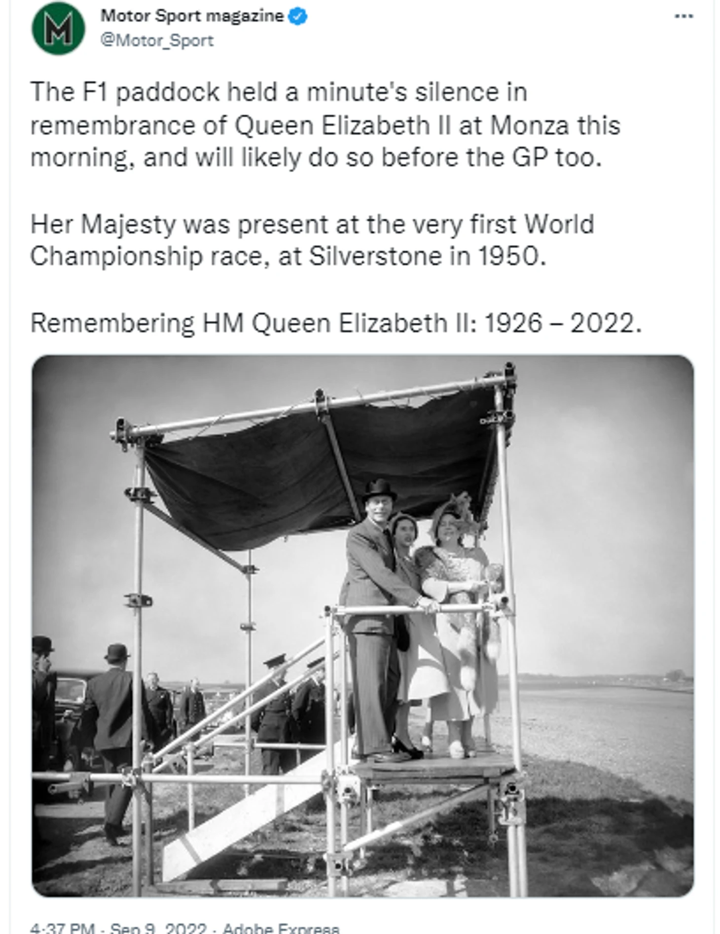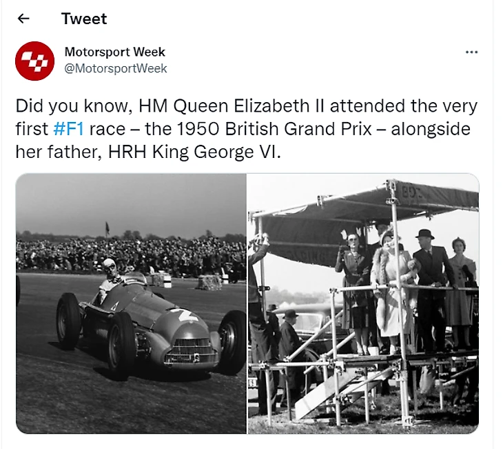 Даже авторитетные издания вроде MotorsportWeek запостили пару кадров с подписью «А вы знали, что Ее Величество Королева Елизавета II посещала самую первую гонку «Ф-1» – Гран-при Великобритании 1950-го – вместе с отцом, Его Королевским Высочеством Георгом VI?»