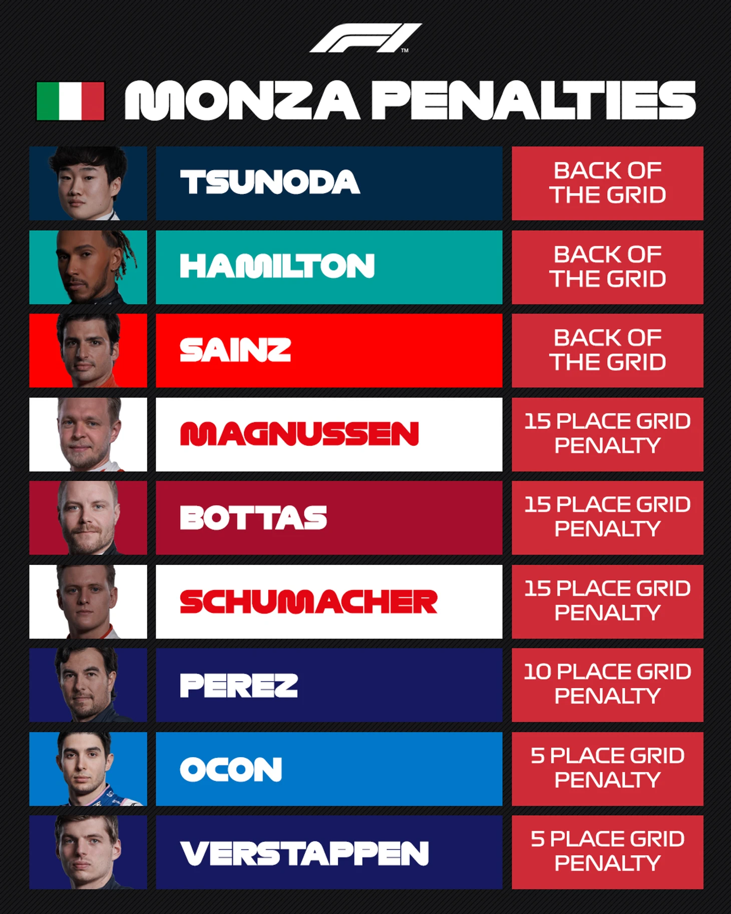 Хэмилтон, Сайнс и Цунода (еще Юки дополнительно получил штраф в десять позиций за пятое предупреждение в 2022 году и в три позиции – за пилотаж под желтыми флагами). отправятся в конец решетки, Боттас, Шумахер и Магнуссен потеряют по 15 позиций, Перес – десять, Окон – пять. Все – за новые моторы, коробки передач и перерасход прочих компонентов.