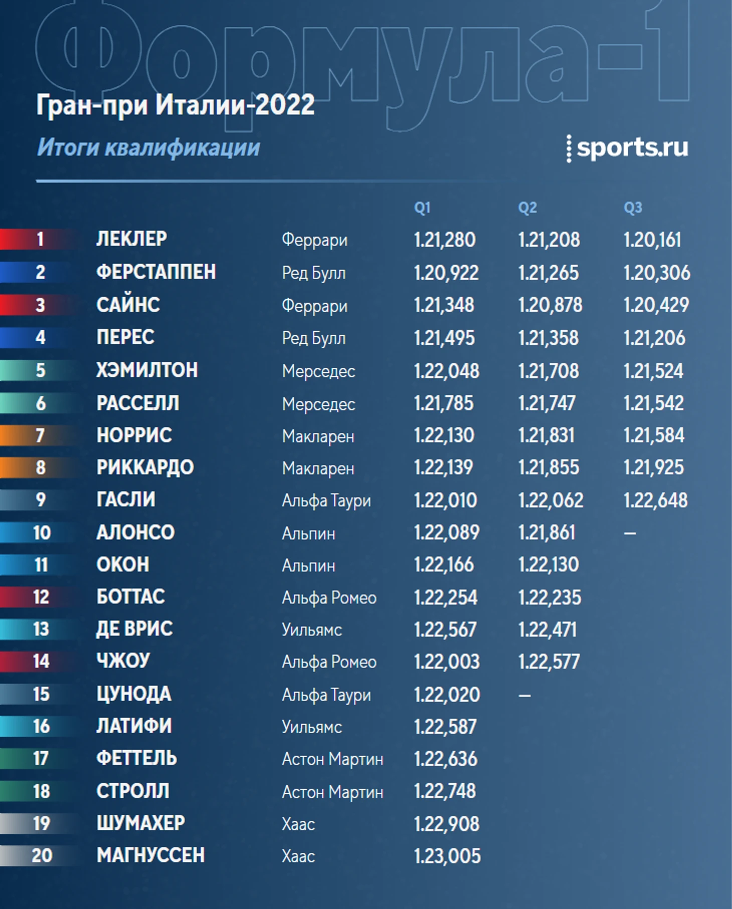 Теперь рядом с Шарлем все равно заезд все равно начнет… Расселл! За Джорджем – Ландо Норрис, а затем уже Ферстаппен (UPD – по новой промежуточной решетке он все-таки 7-й, апдейты собираем здесь).