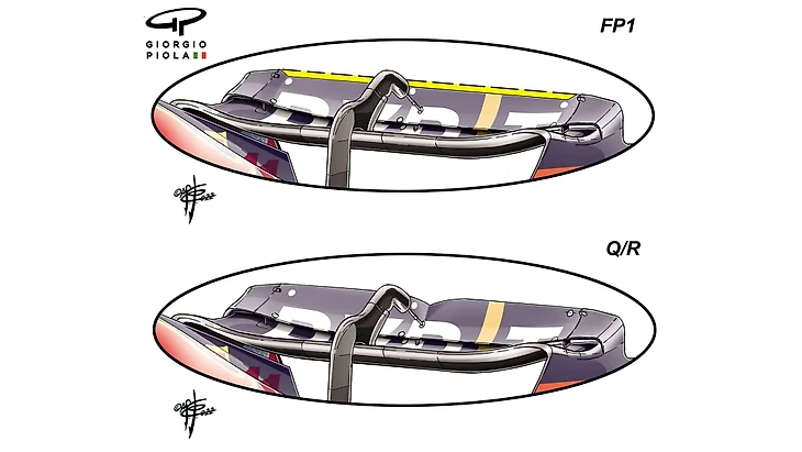 Заднее антикрыло «Ред Булл» в Монце имело большую площадь поверхности, чем у соперников. Его основная плоскость была выпуклой, в отличие от плоскостей «Феррари» и «Мерседеса», которые были абсолютно плоскими. Хотя основная плоскость RB18 была намного меньше, чем обычно, ее выпуклые контуры обеспечивали большую разницу давления между верхней и нижней поверхностями, и, следовательно, большую прижимную силу - и сопротивление.