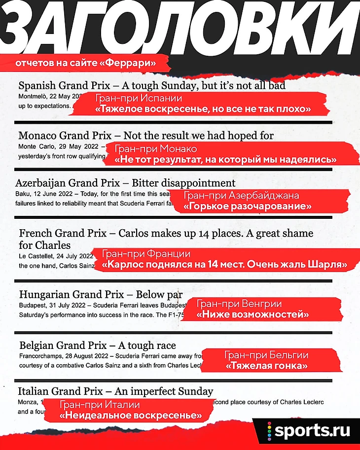 Это ответ на мнения кучи экспертов о положении дел в самой титулованной команде «Ф-1» – их последовательно высказывали после каждого провала, а их за последние 5 Гран-при оказалось слишком много даже по меркам Скудерии: даже победы в Австрии и Великобритании соседствовали со стратегическими или техническими фэйлами.