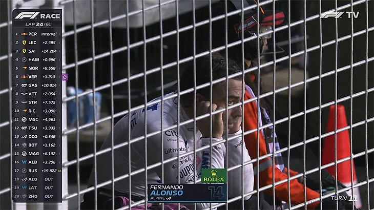 И два круга спустя Фернандо со словами «Мотор, мотор» припарковался на обочине. Ферстаппен освободился, а гоночная дирекция включила режим виртуального сэйфти-кара.