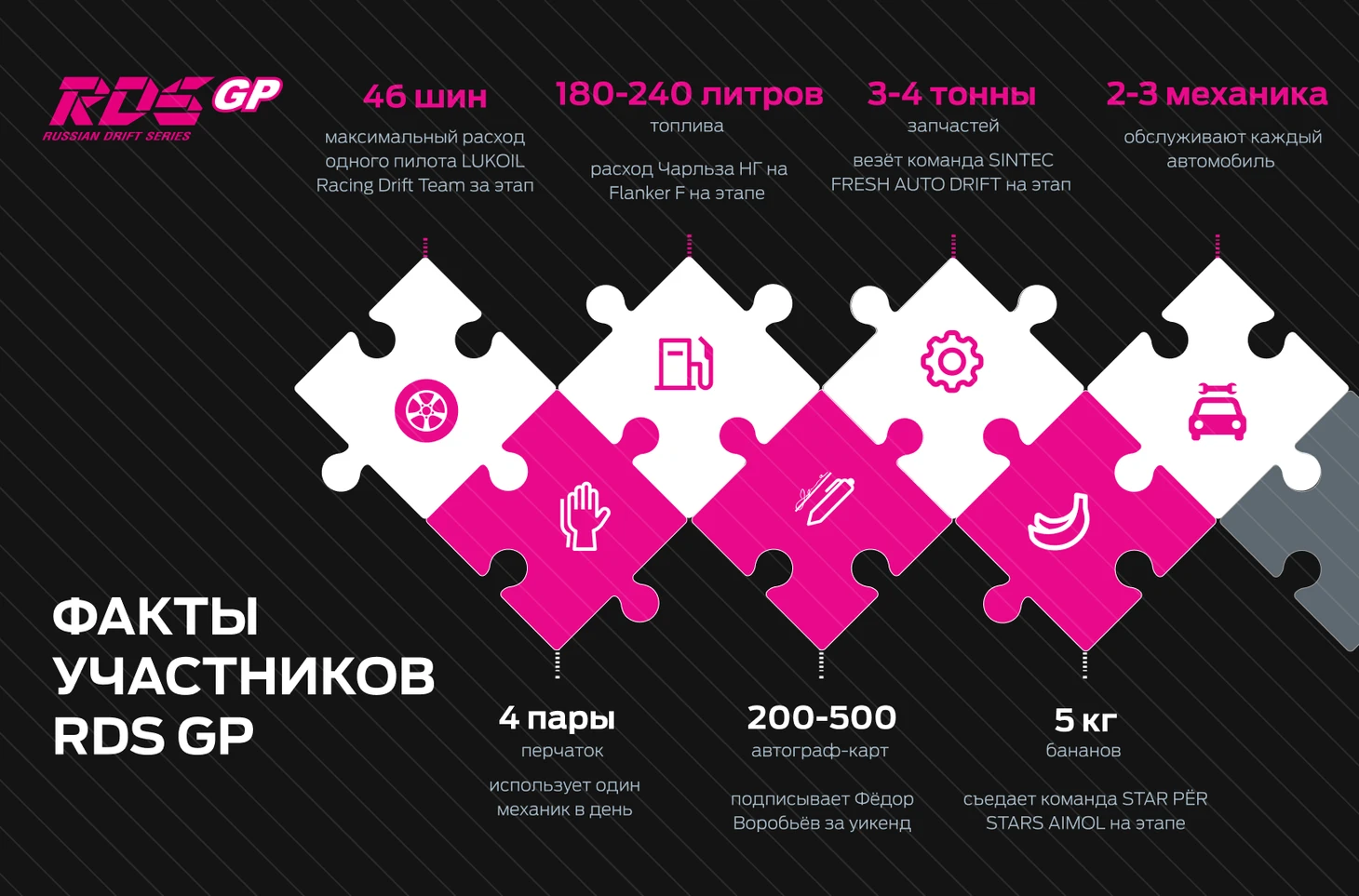 Исследование российского дрифта: за этап пилот сжигает 46 шин, команды везут по 4 тонны запчастей и 5 кг бананов