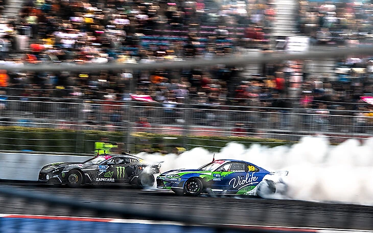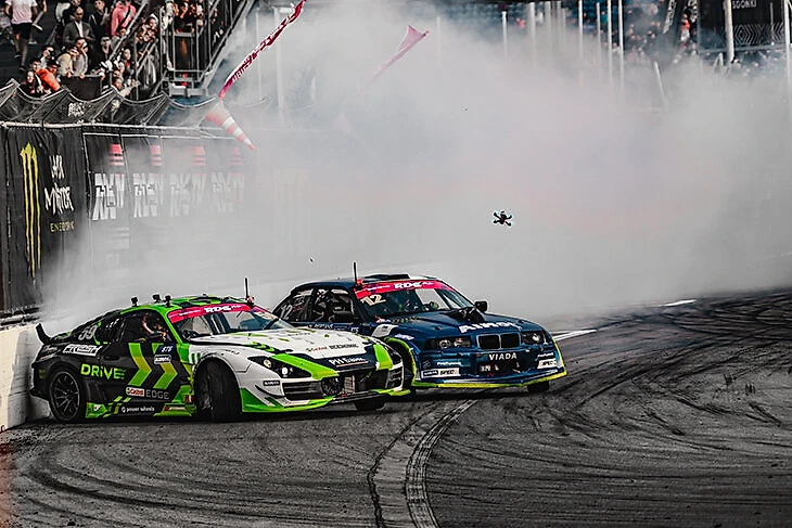 Но не только огнем запомнился финал прошлого сезона. Начиная со стадии ТОП 16, пилоты восхищали зрителей невероятно близким парным дрифтом. Судьям не раз приходилось назначать перезаезды (OMT – one more time), чтобы определить лучшего в некоторых парах спортсменов. Одним из таких OMT стало сражение за третье место между молодым латышом Николасом Бертансом и ирландцем Джеком Шанаханом. Победил в итоге Джек – как в этой дуэли, так и в сезоне RDS GP-2021.