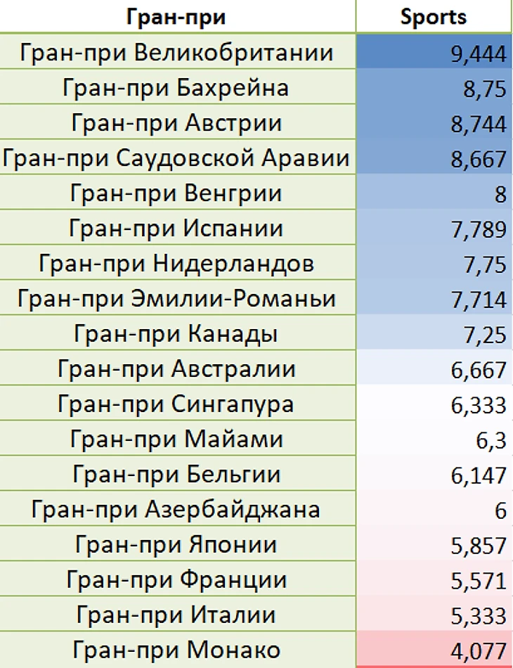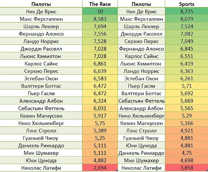Средние оценки за сезон в сравнении с ориентиром в лице издания The Race: