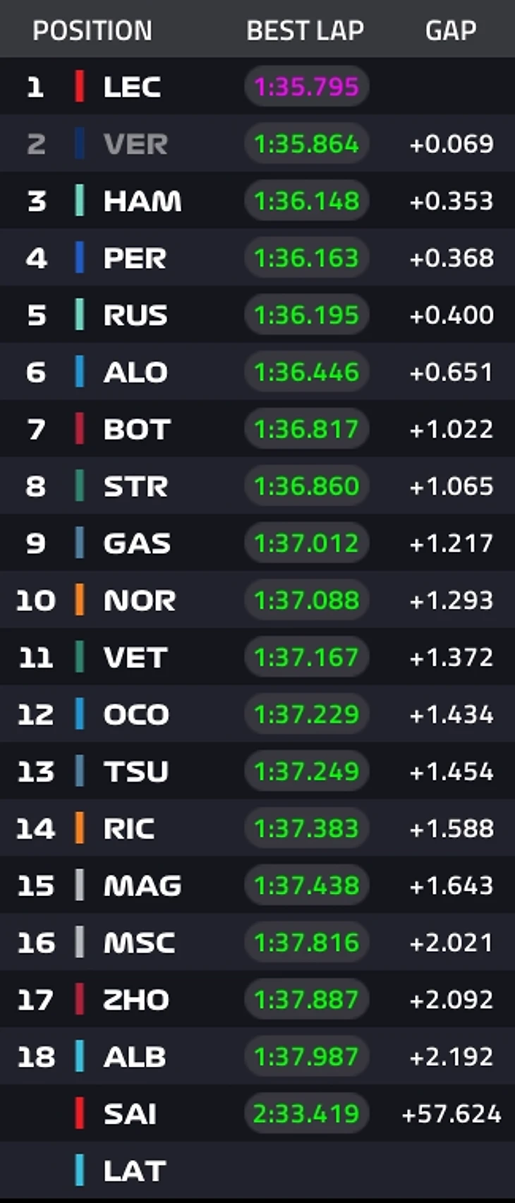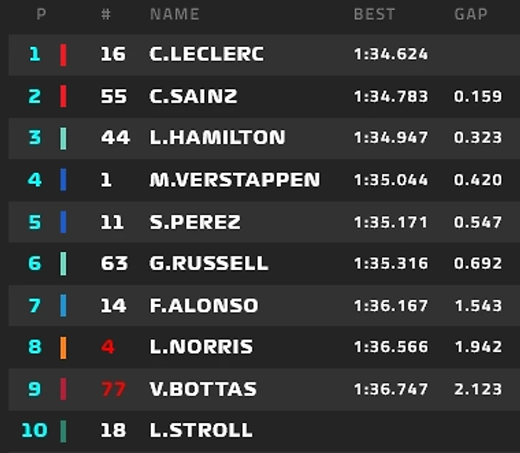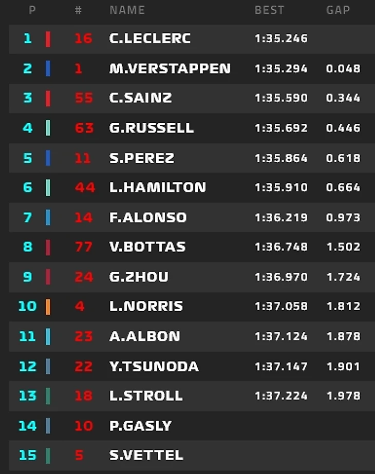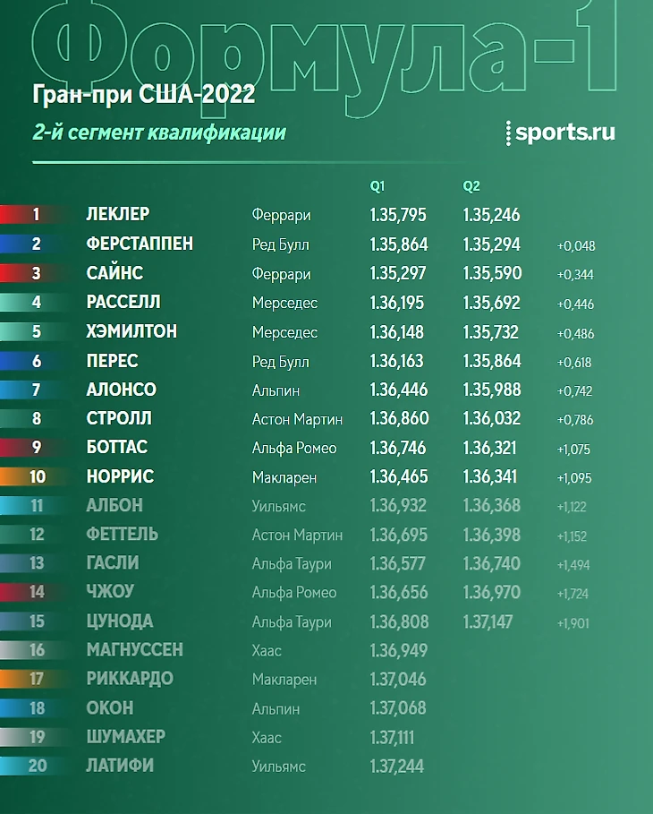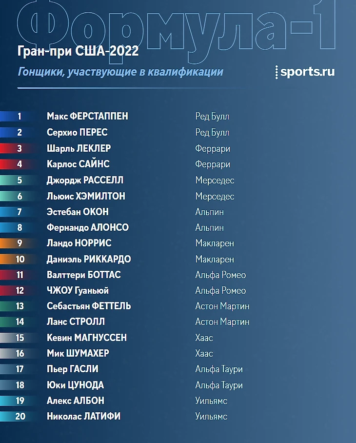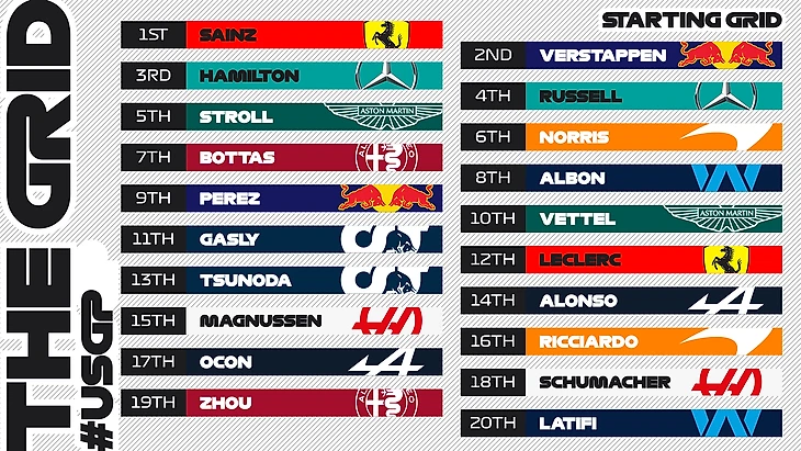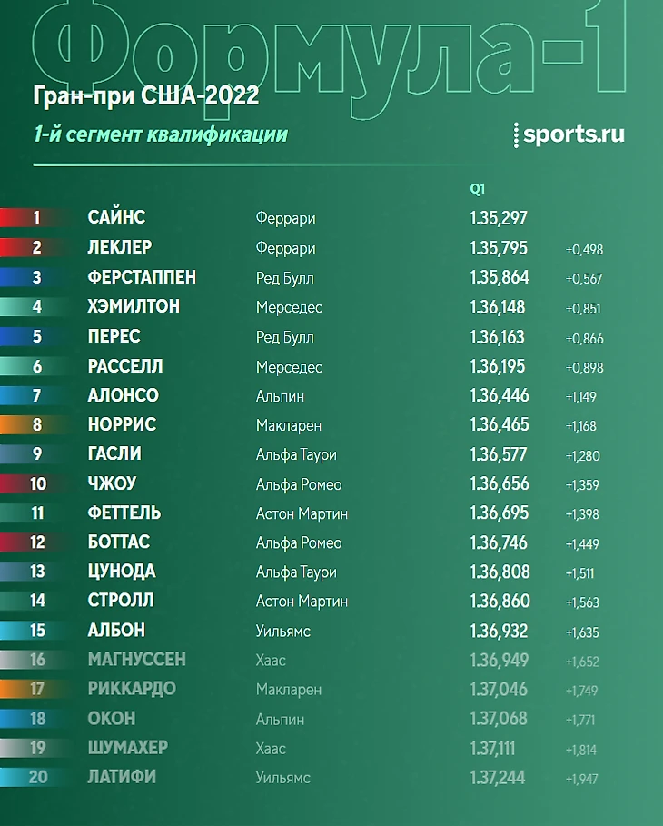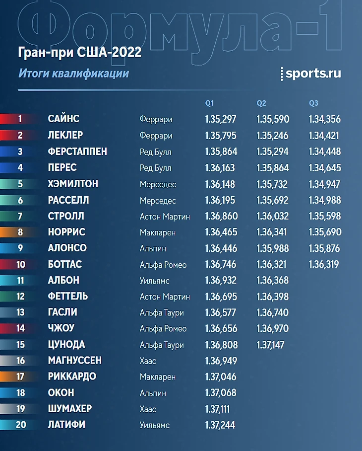 1. Сайнс 2. Ферстаппен 3. Хэмилтон 4. Расселл 5. Стролл 6. Норрис 7. Боттас 8. Албон 9. Перес 10. Феттель 11. Гасли 12. Леклер 13. Цунода 14. Алонсо 15. Магнуссен 16. Риккардо 17. Окон 18. Шумахер 19. Чжоу 20. Латифи