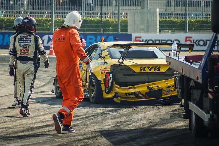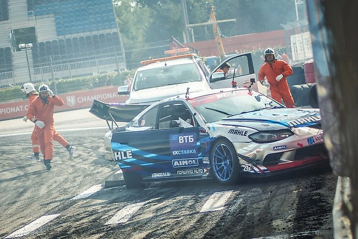 Начав хит преследователем, Сергей не удержал машину и врезался в «Ниссан» FireLady Z Цареградцева. Многострадальное купе Аркадия сначала зрелищно подпрыгнуло, а затем оказалось в объятиях ограждения из покрышеr. Виновником столкновения был признан пилот BY Motorsport, а механикам «FailCrew Дарксайд» предстояло оперативно починить автомобиль своего пилота.